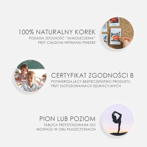 - Powierzchnia tablicy jest odporna na wielokrotne wbijanie pinezek dzięki zastosowaniu wysokiej jakości korka naturalnego o optymalnej elastyczności.