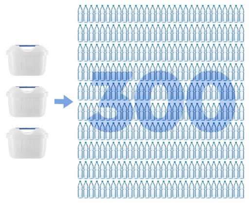 W pakiecie znajdują się 3 filtry, które łącznie mogą oczyścić nawet 450 litrów wody kranowej. Jeśli podzielimy to na półtoralitrowe butelki, to otrzymamy ich aż 300 sztuk! Są to nie tylko bardzo duże koszty, ale również ogromna ilość plastiku. Szacując, że średnia cena jednej butelki to około 2,5 zł, zapłacimy za nie nawet 750 złotych! Jeśli natomiast odejmiemy od tego cenę filtrów oraz niewielki koszt kranówki (około 0,004 grosza za litr), to z tym zestawem FilterLogic uda Ci się oszczędzić ponad 700 złotych!