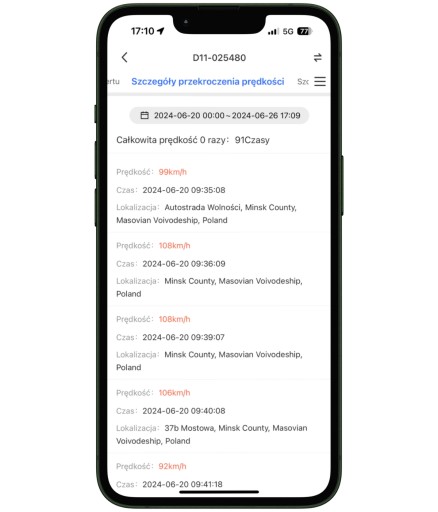 - Alarm przekroczenia prędkości: Powiadomienia o przekroczeniu ustalonych limitów prędkości.