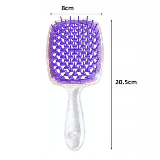Doskonała szczotka do rozczesywania włosów. Specjalnie rozłożone niezwykle elastycznych ząbków umożliwiają szybkie i bezbolesne rozczesywanie włosów. Szczotka wyposażona została w elastyczną siateczkę, dzięki czemu dopasowuje się do kształtu głowy podczas czesania. Szczotka nie uszkadza struktury włosa dodatkowo masuje skórę głowy. Posiada ergonomiczną rękojeść, która wygodnie leży w dłoni, nie wyślizguje się. Szczotka nadaje się do rozczesywania włosów mokrych i suchych.