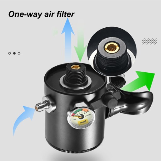 4. Wygodny respirator do nurkowania z adaptera dużej butelki na małą butelkę. Gaz z dużej butelki jest wprowadzany do małej butelki przez adapter, który pełni rolę prowadnicy powietrza. Interfejs do napełniania o średnicy 8 mm ma konstrukcję z blokadą kulkową, która jest trwała i łatwa w obsłudze, dzięki czemu nurkowanie nie wymaga noszenia dużego sprzętu do nurkowania.