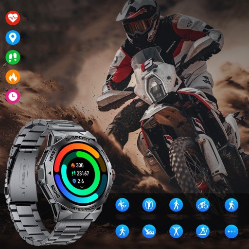 Męski smartwatch outdoorowy posiada 120 różnych trybów sportowych, w tym bieganie, wspinaczkę, jazdę na rowerze, skok w dal, jazdę na nartach, koszykówkę, skakanie i wiele innych trybów fitness. Wbudowane biosensory mogą mierzyć takie dane, jak tętno, przebyty dystans, spalone kalorie i czas ćwiczeń podczas ćwiczeń.