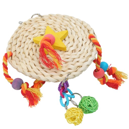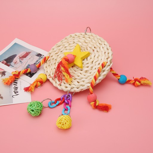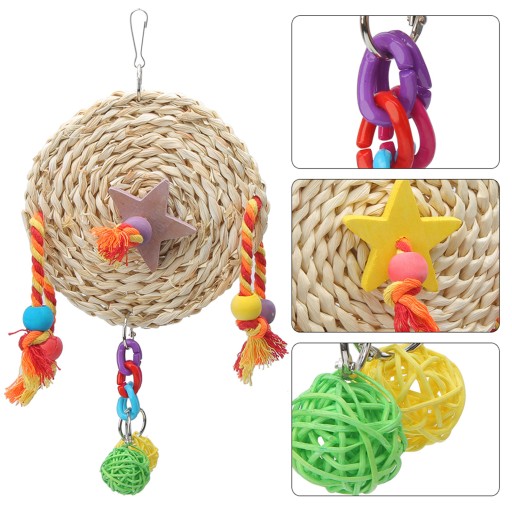 1. Wykonane z plecionej słomy i bloku drewna, bezpieczne i odporne na ugryzienia, przyjazne dla środowiska i nietoksyczne. 2. Jasna i kolorowa zabawka dla ptaków, przyciąga ptaki do zabawy na niej przez długi czas. 3. Może służyć jako zabawka do gryzienia ptaków, a także jako stojak dla ptaków. 4. Wyposażony w hak, łatwy w montażu, powieś go w klatce lub gdziekolwiek chcesz zaoszczędzić miejsce. 5. Jako dekoracja klatki dla ptaków, odpowiednia dla wszystkich rodzajów ptaków i papug.