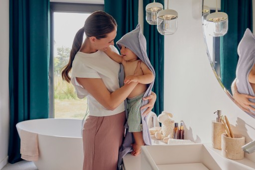 Dziecko okryte ręczniczkiem po kąpieli pozostaje suche. Muslin Hooded Towel bardzo dobrze odprowadza wodę.