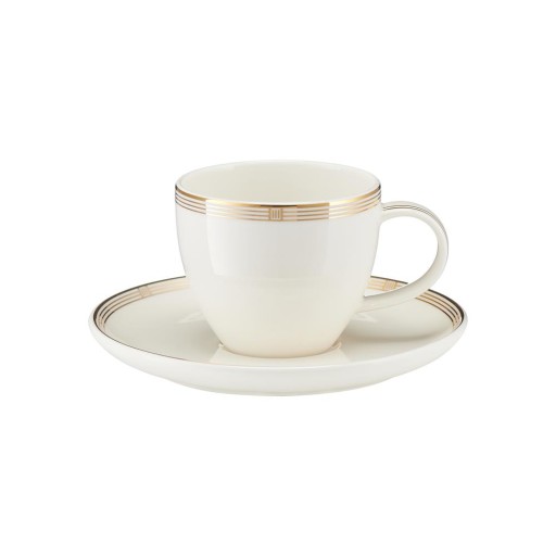 Elegancka filiżanka do espresso ze spodkiem, z kolekcji Liguria. Ponadczasowa w swej formie, zdobiona złotem na obrzeżach i uchu. Kolekcja LIGURIA oczarowuje prostotą i estetyczną formą. Zaokrąglone kształty naczyń nadają jej nowoczesnego charakteru. Na szczególną uwagę zasługuje linia dzbanka do herbaty, cukiernicy i mlecznika. Wygodne uchwyty naczyń zapewniają komfort użytkowania. Subtelny, złoty wzór o geometrycznej formie, dodaje naczyniom lekkości i wykwintnego sznytu. Kolekcja wykonana została ze szlachetnej ceramiki (półporcelany) w odcieniu śmietankowej bieli. Filiżanki LIGURIA i uświetnią spotkania w gronie przyjaciół, nadając im wyjątkową oprawę. Filiżanka do espresso ze spodkiem LIGURIA, zapakowana w osobne białe pudełko z logo marki, jest doskonałą propozycją na upominek.