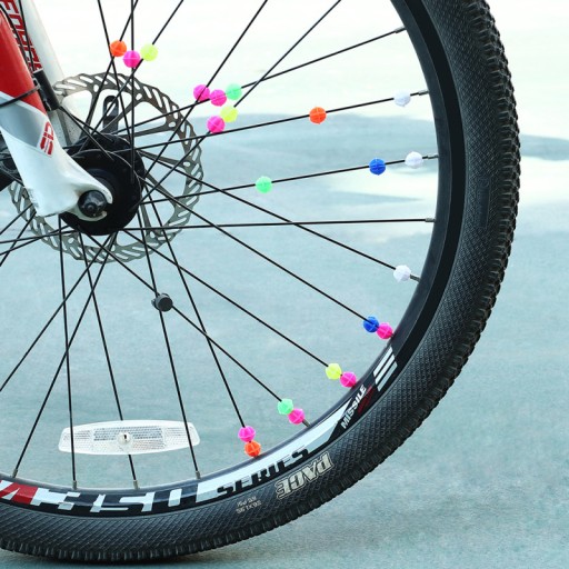 Zestaw ok. 36 dekoracyjnych koralików na szprychy, np. w rowerze lub wózku dziecięcym.
