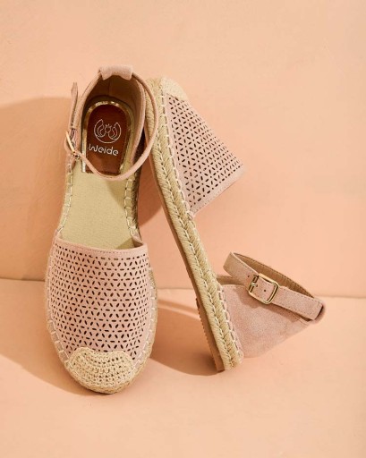Wyjątkowe damskie espadryle z eko zamszu i tkaninowej wkładki. Płaska podeszwa zdobiona sznurkiem jutowym zapewnia wygodę. Zapinane na sprzączkę. Doskonały dodatek do letnich stylówek!