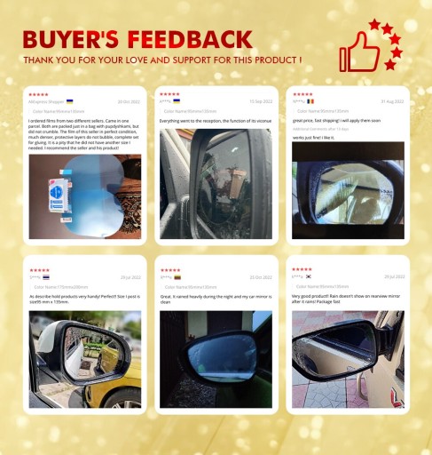 Funkcja: -To wyświetlacz tyłu samochodu folia odblaskowa ma dwa warstwa ochronna PET i jeden nano-warstwy kleju, ma wysoka przepuszczalność, anti-fog, anti-glare, anti-mgły, odporna na olej, anty zarysowania, wodoodporny, przeciwdeszczowe i inne funkcje, zapewniające niespotykane dotąd bezpieczeństwo i wyraźny obraz nawet w deszczowe i mgliste dni. -Anti-fog i anti-fog, odporne na deszcz i trwałe, użyj narzędzi do skrobania, ręcznik, chusteczka, ręcznik papierowy, gotować do różnych testów, efekt deszczu jest nadal bardzo dobry,, test temperatury żel jest stabilny, nigdy nie opuścić. -Bezpieczny i ochronny. Folia przeciwodblaskowa wykonana z przyjaznego dla środowiska PET i nanomateriał, brak uszkodzeń lustra. -Uniwersalna folia ochronna lusterek wstecznych do samochodów, Suv, ciężarówek, przyczep itp., która pasuje do wszystkich standardowych rozmiarów lusterka boczne. Różne okazje:Zastosuj do naklejka na samochodowe lusterko wsteczne, boczna szyba, lustro łazienkowe, lustro kosmetyczne i inne szklane lustra. Dane techniczne: Rozmiar: 95*95mm (około 3.75 cala x 3.75 cala) / 95*135mm (około 3.75 cala x 5.31 cala) / 175*200mm (około 6.88 cala x 7.87 cala)/ 200*240mm(7.87 ''× 9.44 ''approx)/160*350mm (6.29'' × 13.77' 'approx) Łatwa instalacja: -Użyj czysta ściereczka w opakowaniu, aby oczyścić kurz i brud z lustra, i posyp trochę wody lub spryskaj trochę alkoholu przed nałożeniem wodoodpornej folii lusterka wstecznego, przymocuj folię ochronną do lustra i wklej ją, użyj skrobaka do czyszczenia wody i powietrza w środku Pakiet zawiera: 1 zestaw naklejka na samochodowe lusterko wsteczne folia ochronna (2 sztuki) Obiecujemy: -Darmowy prezentDla ciebie: zestaw montażowy (1 × lepki papier; 1 × skrobak; 1 × ręcznik; 2 × papier do czyszczenia) -Bezpłatna gwarancjaDla ciebie: naklejka zła bezpłatna wymiana (nowa aktualizacja naklejka przeciwdeszczowa łatwoprzylepna, naklejka zła stawka mniejsza niż 3%) -WyczyśćDla ciebie: wysoka rozdzielczość i wyraźny obraz (im więcej deszczu, tym jaśniejszy) -WygodaDla ciebie: folia ochronna łatwa do rozdarcia łatwoprzylepna. l (zwiększona wytrzymałość, niełatwa do wklejenia zła) Nazwa marki : YRMCC Umieszczenie naklejki : LUSTERKO WSTECZNE Pochodzenie : CN (pochodzenie) Typ artykułu : Naklejki Opakowanie : Bez opakowania Feature 1 : Car Protective Film For Car Rearview Mirror Feature 2 : Car Rearview Mirror Feature 3 : Anti Fog Car Sticker Feature 4 : Car Mirror Window Clear Film Feature 5 : Mirror Protective Film Feature 6 : Car Rearview Mirror protective Feature 7 : Anti Fog Window Clear Feature 8 : Rainproof Waterproof Mirror Film Feature 9 : Car Rainproof Film Feature 10 : Car Accessries Feature 11 : Motorcycle Car Truck Mirror Film