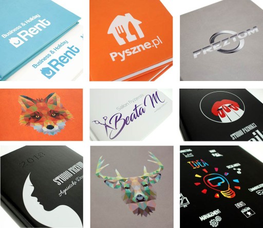 Bardzo dobrej jakości kalendarze drukowane i składane w Polsce, w oprawie typu Vivella. Format A5 (14,5 x 20,5 cm), 360 stron, układ dzienny (sobota i niedziela na jednej stronie), barwna i miękka okładka, indywidualny nadruk tworzony na podstawie przesłanego pliku graficznego - wektorowego tzw. krzywe (przykładowy format zapisu: .eps, .ai, .cdr, .svg, .pdf).