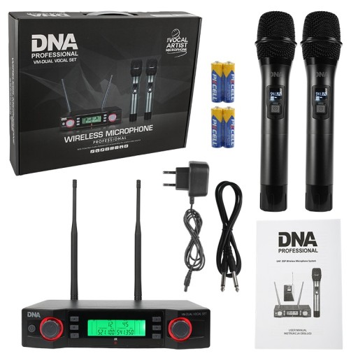 DNA VM – DUAL VOCAL SET to wysokiej jakości bezprzewodowy system mikrofonowy oparty na technologii cyfrowej. Zestaw składa się z odbiornika (UHF) oraz dwóch mikrofonów doręcznych. Idealnie sprawdza się podczas koncertów i występów na żywo, eventów, na weselach, w klubach z karaoke, a także w mobilnej pracy DJ-ów.