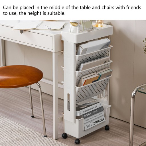 1. [Materiał z tworzywa sztucznego]: Ruchomy regał na książki wykonany jest z trwałego tworzywa sztucznego, pogrubionego i wzmocnionego, krawędzie są gładkie i nie są szorstkie, co zapewnia bezpieczeństwo i wygodę użytkowania.