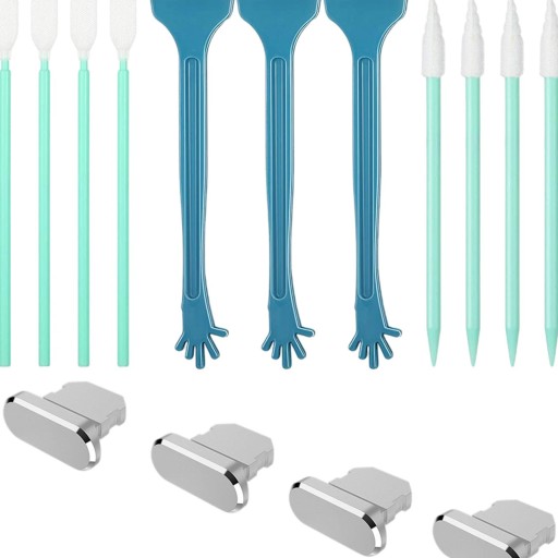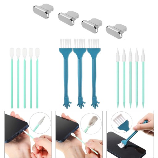 Zawartość opakowania: 4 x metalowe zatyczki przeciwkurzowe do telefonu, 3 x szczoteczka do czyszczenia głośników telefonu, 10 x waciki Kompleksowy zestaw, który spełni Twoje wymagania dotyczące czyszczenia telefonu