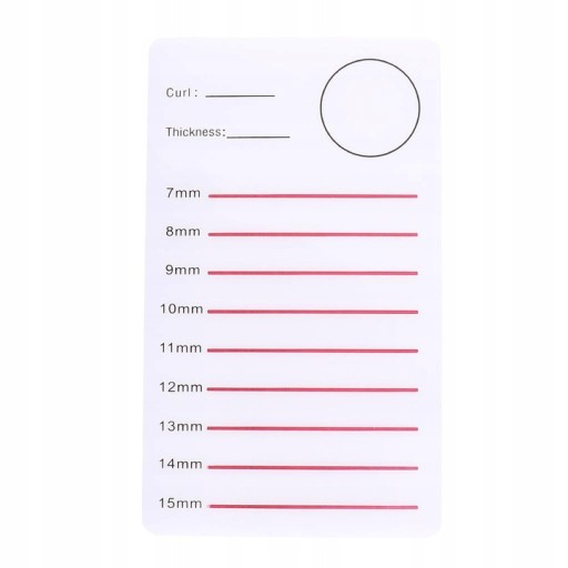 Podkładka pod rzęsy z numeracją długości, miejscem na klej oraz adnotację dotyczącą skrętu i grubości rzęs, na których w danym momencie pracujemy. To niezbędnik do pracy dla stylistek rzęs.
