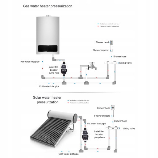 3. ZABEZPIECZENIE PRZED NIEDOBOREM WODY: Gdy przepływ wody jest zbyt mały, aby uruchomić się automatycznie, pompa wspomagająca może zostać przełączona w tryb niskiego ciśnienia. Kiedy wlot wody zbliża się do 0, pompa wodna przestaje działać.