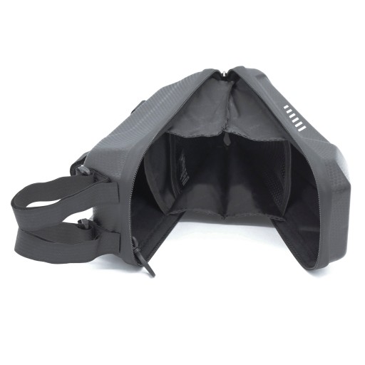 Ta czarna torba na hulajnogę wykonana jest z trwałego tworzywa PC, a w jej wnętrzu znajdują się trzy osobne przegrody, które ułatwiają organizację przestrzeni. Wytrzymały materiał zapewnia ochronę wartościowych przedmiotów przed uszkodzeniem w wyniku kolizji lub upadku. Dodatkowo materiał ten jest wodoodporny i odporny na różne warunki atmosferyczne.