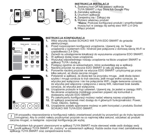 - Wtyczka WiFi umożliwia tworzenie harmonogramów. Dzięki temu ustawia się automatyczne włączanie lub wyłączanie poszczególnych urządzeń oraz całych grup w zaplanowanym dniu i porze. Wtyczka SMART EDO jest kompatybilna z aplikacją TUYA na urządzenia mobilne z systemem Android lub iOS.