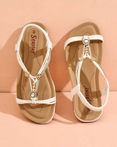Damskie sandałki na płaskiej podeszwie - to idealny pomysł na gorące letnie dni. Model całościowo wykonany ze skóry ekologicznej matowej. Cholewka udekorowana ozdobnymi dżetami.