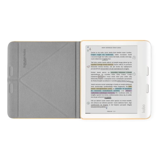 Przednia klapka pokrowca składa się, tym samym tworząc wygodną podstawkę pod czytnik, który można ustawić zarówno w pionie, jak i w poziomie. Zamontowane w etui magnesy przyczyniają się do stabilności podstawki, a zarazem zapewniają dobre zamknięcie, kiedy Kobo Libra Colour nie jest w użyciu.