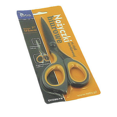 Nożyczki wykonane ze stali nierdzewnej. Posiadają wygodny w użyciu uchwyt, idealnie dopasowany do kształtu dłoni, pokryty wysokiej jakości miękkim tworzywem. Ostrze pokryte fluorem, dzięki temu jest odporne na przywieranie kleju oraz taśmy klejącej