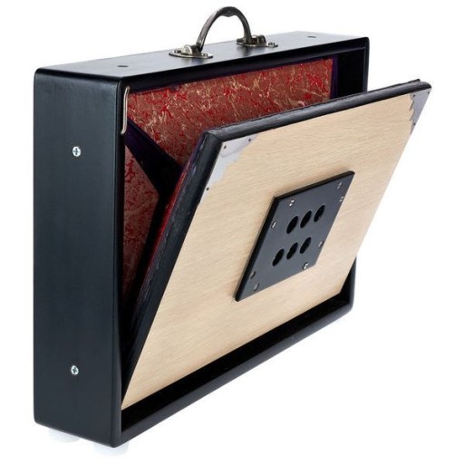 - Korpus wykonany z twardego drewna z metalowymi okuciami