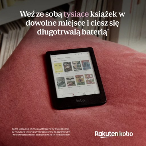 ** Jedno ładowanie czytnika wystarcza na 42 dni codziennej 30-minutowej lektury przy jasności ekranu na poziomie 30% i wyłączonej technologii bezprzewodowej Wi-Fi i Bluetooth®.