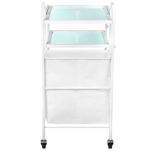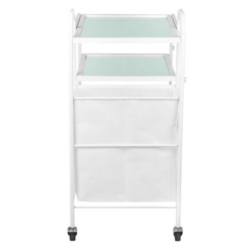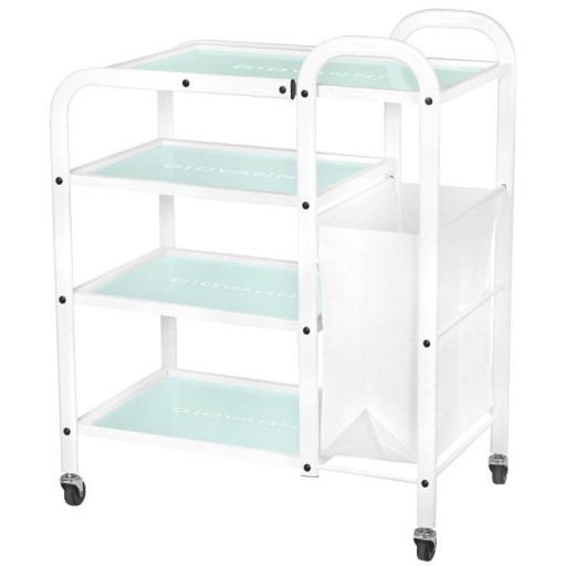 Funkcjonalny metalowo-szklany stolik na gumowych kółkach. Stolik posiada cztery szklane półki z grawerowanym logo firmy GIOVANNI. Dodatkowym atutem stolika jest przymocowany do niego worek na brudne ręczniki i opaski kosmetyczne.