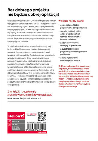 Ta książka jest doskonałym uzupełnieniem podręcznej biblioteczki każdego programisty C++. Opisano w niej znaczenie dobrego projektu oprogramowania oraz zasady tworzenia takich projektów. Omówiono szereg przydatnych wzorców projektowych, dzięki którym łatwiej można zrozumieć, jak zarządzać zależnościami i abstrakcjami, zwiększać możliwości modyfikowania i rozszerzania tworzonego kodu oraz stosować nowoczesne wzorce projektowe. Zaprezentowano wzorce wykorzystujące wiele różnych paradygmatów, w tym programowanie: obiektowe, uogólnione oraz funkcyjne. Pokazano też największą zaletę nowoczesnego języka C++: możliwość łączenia różnych paradygmatów oraz tworzenia oprogramowania, które przetrwa dziesięciolecia.