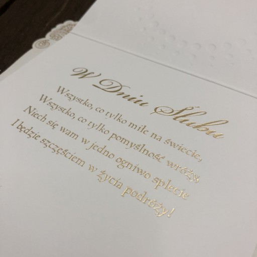 Papierowo - drewniana kartka z okazji Ślubu z pięknym tłoczeniem na bokach oraz drewnianą ozdobą, w kolorze ecru, z napisem "W dniu Ślubu". W zestawie koperta w tym samym kolorze.