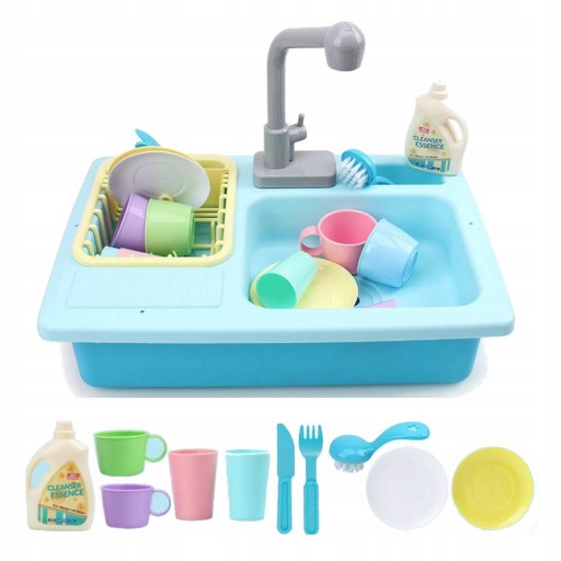 W zestawie naczynia, sztućce oraz butelka płynu do mycia - pełna zestaw do zabawy.