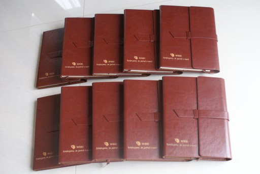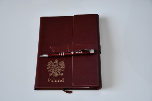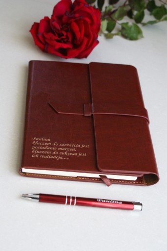 Elegancki notes formatu A5 w klasycznej okładce wykonanej z ekoskóry. Notes zawiera 80 kartek w linie oraz praktyczną wstążeczkę - zakładkę. Wewnątrz okładki miejsce na 3 wizytówki, długopis (jest w komplecie) oraz pamięć USB (brak w komplecie). Okładka nie jest umocowana na stałe do bloku notesu, tylko nasuwana na pierwsze kartki, co daje możliwość wymiany notesu. Notes zamykany za pomocą paska z ekoskóry. Na okładce wykonujemy grawer według Twoich informacji. (przed wykonaniem możemy zrobić projekt)