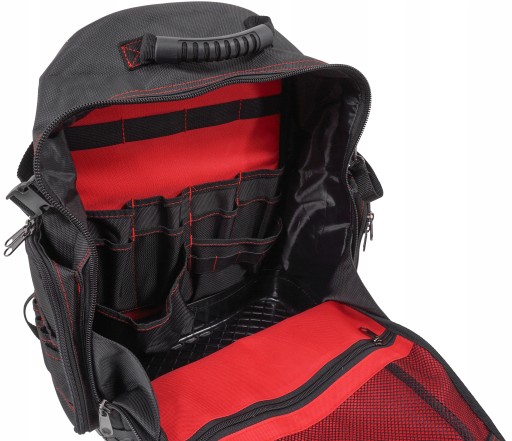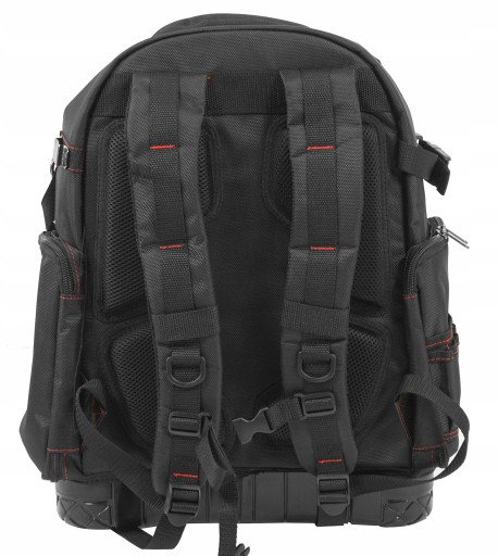 Bardzo wytrzymały plecak narzędziowy, wykonany z polyestru 1680D. Podstawa z twardego plastiku umożliwia postawienie torby i zapewnia maksymalną ochronę przy każdej pogodzie. Wyściełane, przepuszczające powietrze paski, bardzo wygodne i solidnie wykonane. Dla lepszego komfortu noszenia dodatkowa wyściółka na plecach. Odginana przednia kieszeń dla łatwiejszego dostępu i przechowywania większych przedmiotów. Pionowa ścianka narzędziowa maksymalizuje przestrzeń do przechowywania zwalniając miejsce na duże przedmioty. Zewnętrzne troki umożliwiają przypinanie przedmiotów. Liczne kiesznie boczne pełnią funkcę oragnizerów na drobne przedmioty. Wyposażony w utwardzany piórnik na okulary. Szwy oraz główny zamek wykonane w wersji wzmocnionej, przystosowane do dużych obciążeń. Materiał poliester 1680D. Tkaniny o splotach 1680D należą do grupy najbardziej wytrzymałych i trwałych materiałów. Gęsta gramatura zapewnia wyrobom wyjątkową wytrzymałość oraz odporność na różnego rodzaju uszkodzenia mechaniczne. Tkaniny charakteryzują się wyraźną strukturą splotu oraz posiadają dodatkowe powleczenie z PU. Taki sposób impregnowania wzmacnia materiał i nadaje tkaninie właściwości bryzgoszczelne.