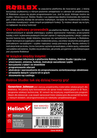 Roblox to popularna platforma do tworzenia gier, z której korzystają użytkownicy o różnym poziomie umiejętności w zakresie ich projektowania. W Robloksie używa się języka programowania Lua. Jest to język, którego można się szybko i łatwo nauczyć. Roblox Studio i Lua zapewniają idealne środowisko dla twórców gier, a także prosty dostęp do serwerów multiplayer, narzędzi do modelowania światów, systemów monetyzacji i wielu innych przydatnych funkcji. Ty możesz skupić się na tym, co najlepsze: na pracy twórczej!Oto wyjątkowy przewodnik po platformie Roblox. Składa się z 24 lekcji skonstruowanych w sposób ułatwiający szybkie opanowanie materiału; przeczytanie każdej z nich i wykonanie podanych ćwiczeń zajmie Ci najwyżej godzinę. Lekcje i zadania łącznie tworzą kurs, dzięki któremu nauczysz się samodzielnie kodować w Robloksie. W ramach pracy z książką przygotujesz sobie środowisko pracy, zaczniesz się płynnie posługiwać potrzebnymi narzędziami i szybko napiszesz swoją pierwszą grę. Naukę ułatwią Ci instrukcje krok po kroku, liczne ćwiczenia i pytania sprawdzające, a także quizy, wskazówki i przydatne ostrzeżenia. Szybko się przekonasz, jak proste, przyjemne i satysfakcjonujące jest używanie Robloksa!W książce między innymi: podstawowe informacje o platformie Roblox, Roblox Studio i języku Lua właściwości, zmienne, funkcje, instrukcje warunkowe i pętle korzystanie z tabel i słowników programowanie zdarzeń abstrakcje i wprowadzenie do programowania zorientowanego obiektowo utrwalanie danych i użycie ich w grach stosowanie raycastinguRoblox Studio: tak się dzisiaj tworzy gry!