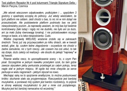 Korpus Platformy Numer 4 składa się z 5 warstw zbudowanych z 3 rodzajów materiałów antywibracyjnych. Dwie zewnętrzne warstwy wykonane są z naszego twardego antywibracyjnego materiału firmowego. Wewnątrz jest warstwa z drewna egzotycznego średniej twardości, oddzielona od reszty dwoma warstwami z miękkiego materiału antywibracyjnego. Platforma stoi na stopkach kulkowych Nr 1 posiadających 5 warstw antywibracyjnych. Razem więc Platforma Numer 3 posiada 10 warstw antywibracyjnych, na zmianę z twardego, średniego i miękkiego materiału.