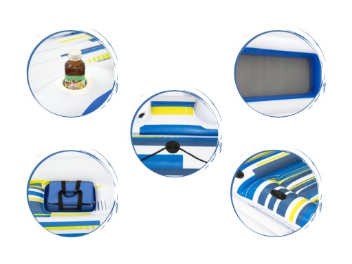 Materac o wymiarze 389x274cm jest przeznaczony aż dla 6 osób. Dodatkowo w materacu zastosowano system komór, które zapewniają odpowiednią sprężystość materaca Do zestawu dołączono łatkę naprawczą. Przenośna torba termoizolacyjna pozwoli na schłodzenie napojów w gorące dni Wyspa posiada wbudowane uchwyty i praktyczną linkę ułatwiającą holowanie i wchodzenie na wyspę. W środku basenik do chłodzenia nóg.