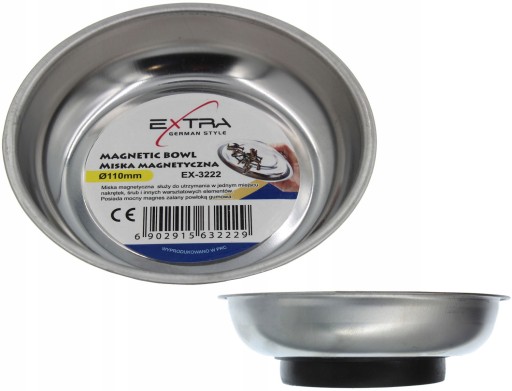 Miska magnetyczna, dzięki której można utrzymać w jednym miejscu nakrętki, śruby, podkładki oraz wiele innych warsztatowych elementów. Metalowa miska o średnicy 110mm posiada mocny magnes pokryty gumową powłoką, która zabezpiecza przed porysowaniem polerowanych czy lakierowanych powierzchni.