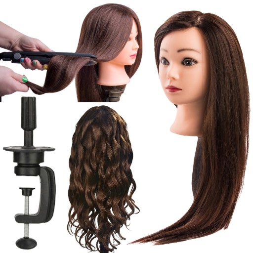 Treningowa główka fryzjerska damska z 60% włosem naturalnym 40% włos termiczny KOLOR CIEMNY BRĄZ (długość 60 cm)+ uchwyt
