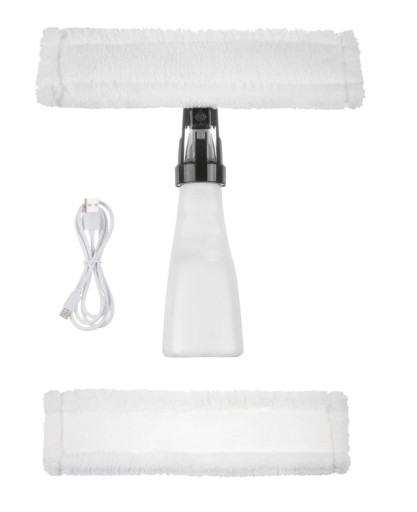 - Elementy zestawu: akumulatorowa myjka do okien, ssawka, butelka z rozpylaczem z 2 nasadkami do wycierania, kabel USB typu A-C