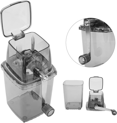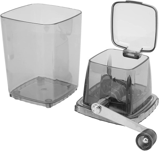 4. Jest łatwy w użyciu, wystarczy dodać kostki lodu do górnego pojemnika, zamknąć pokrywę i zacząć wielokrotnie obracać uchwytem, widać, że kostki lodu są kruszone.