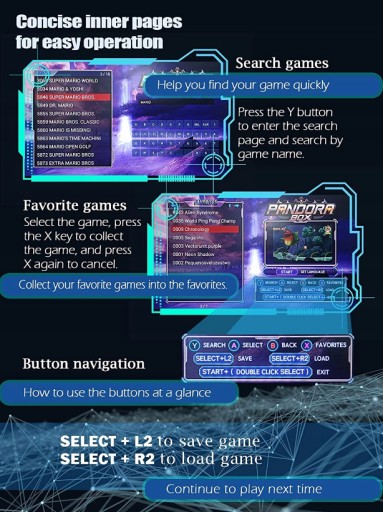 Multi-functional gaming console: This gaming console has many features including game archive, search function, collection function, adding games, TF card expansion, game download, etc. You can download your favorite games, and the process of use is simpler and more convenient.