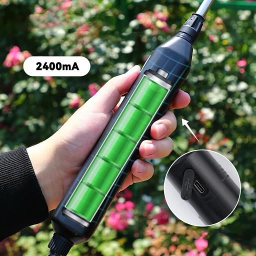 Ten akumulatorowy opryskiwacz ciśnieniowy jest wyposażony w zasilany akumulatorowo uchwyt, który umożliwia włączanie i wyłączanie opryskiwacza w dowolnym momencie za pomocą jednego przycisku, bez konieczności ręcznego pompowania, automatyczne opryskiwanie. Wydajna bateria o pojemności 2400 mAh może pracować nieprzerwanie przez 2-3 godziny po pełnym naładowaniu.