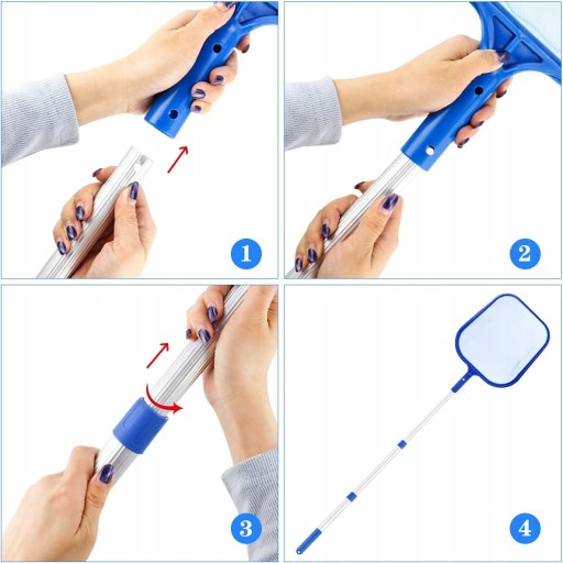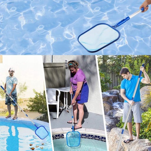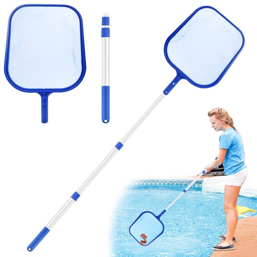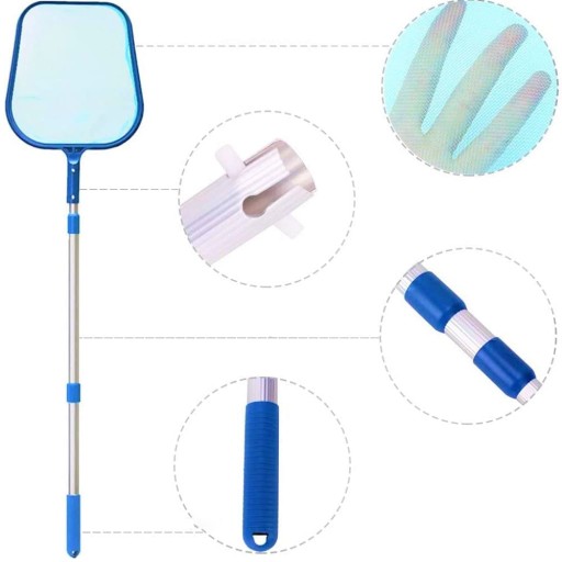 - Chowany podbierak basenowy do łatwego wygarniania liści, owadów i innych zanieczyszczeń z basenów, stawów, jacuzzi, fontann lub dużych zbiorników rybnych.