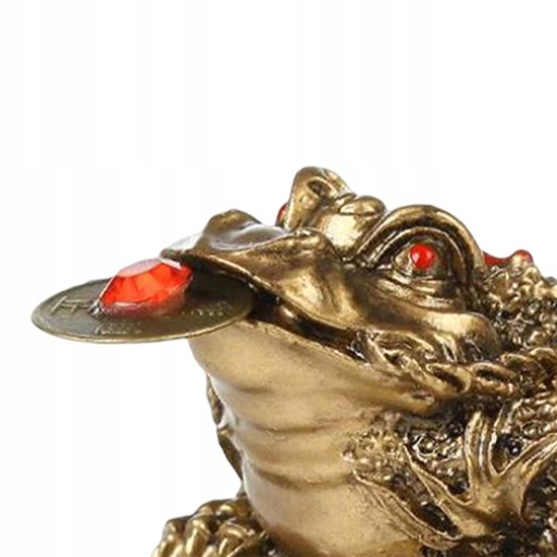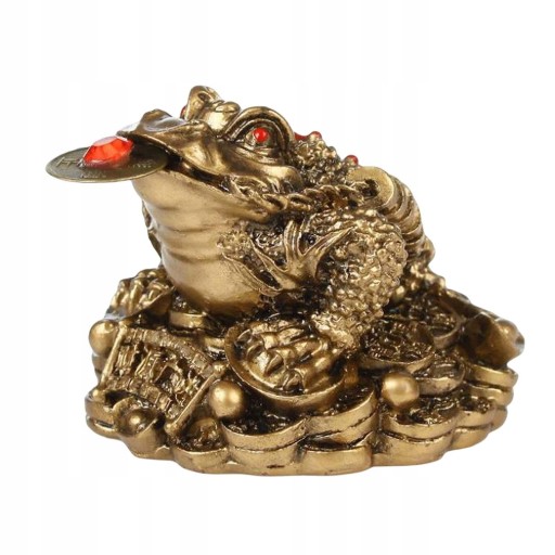 Przyciągaj bogactwo: żaba siedzi na tradycyjnej chińskiej miedzianej monecie z dwoma ciągami monet na odwrocie i monetą w ustach, symbol fortuny dzięki biznesowi