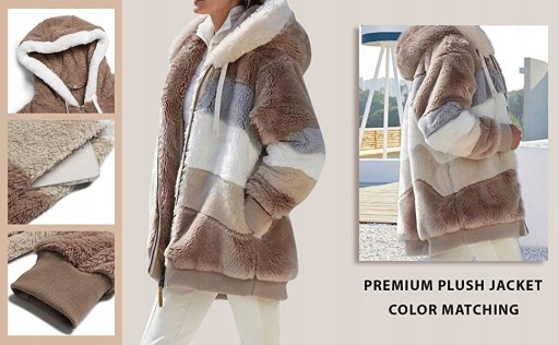 Codzienny płaszcz dla kobiet ma kaptur, zamek z przodu, miękki i wygodny materiał polarowy, modny patchwork w kolorowe bloki, dwie boczne kieszenie i oversize'owy krój, który zapewnia kobietom więcej ciała.