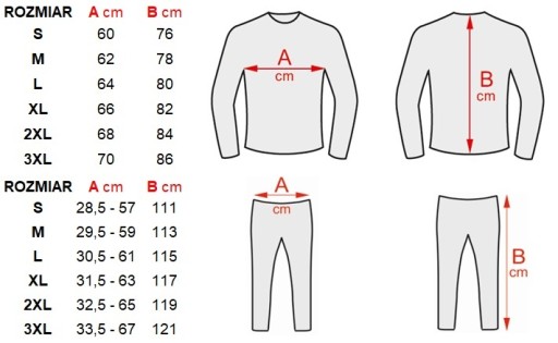 Aby prawidłowo dobrać rozmiar należy zmierzyć ubranie o podobnej konstrukcji z własnej garderoby i porównać z poniższą tabelą: