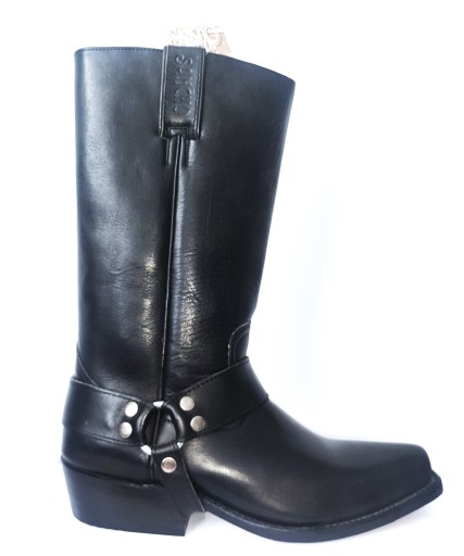 Piękny model długiego kowbojka. Całość wykonana z najlepszych skór. Kolor czarny. Wierzch skóra, wykończenie wnętrza-skóra, podeszwa-skóra, obcas-drewno. Możliwa do odpięcia ostroga. Ręczna robota. 'Original Goodyear welt'. Nowe, z oryginalnym pudłem.