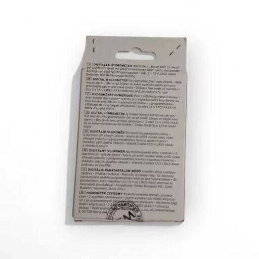 Do kontroli klimatu w pomieszczeniuAlarm w przypadku zbyt wysokiej lub zbyt niskiej wilgotności powietrza, możliwość zaprogramowania górnej i dolnej granicy zakresuWskazanie pięciu różnych stopni wilgotności: za sucho, sucho, optymalnie, wilgotno i za wilgotnoWskazuje temperaturę, wilgotność powietrza i punkt rosyMierzy temperaturę w zakresie od 0 do 50C i wilgotność powietrza od 20 do 95%Indywidualny montaż dzięki rozkładanej nóżce lub oczku do wieszania z tyłuProdukt testowany na obecność substancji szkodliwych - przez zewnętrzne, akredytowane instytuty