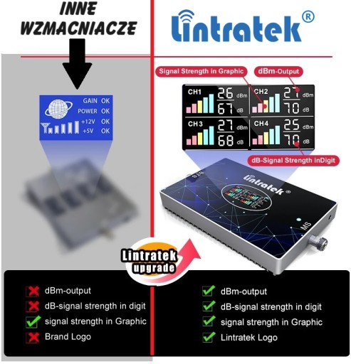 ⭐ Ten model LINTRATEC KW20L mobilnego wzmacniacza może pracować jednocześnie na czterech różnych częstotliwościach - 900 MHz, 1800 MHz, 2100 MHz. 3-pasmowe wzmacniacze sygnału komórkowego są dostępne dla wszystkich operatorów komórkowych w UE.