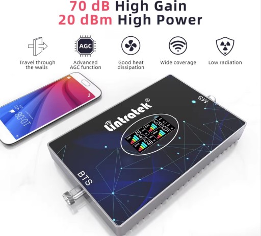 Wzmacniacz komórkowy Lintratek ma bardzo wysokie wzmocnienie 68dB, co może z łatwością poprawić sygnały komórkowe w pomieszczeniach, odpowiednie dla wielu użytkowników i urządzeń, dzięki czemu wszyscy doświadczają mniejszej liczby zerwanych połączeń i lepszej jakości głosu oraz szybszego połączenia z Internetem