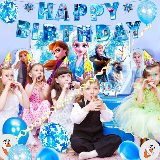 Dekoracja urodzinowa Anny i Elsy dzięki pięknym motywom z kreskówek i jaskrawym kolorom zaspokaja wyobraźnię dzieci na imprezie tematycznej z Krainy Lodu i jest bardzo popularna wśród rodzin i dzieci.