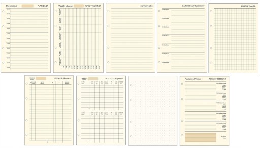 - po 3 kartki: plan dnia, plan tygodnia, zapamiętaj, finanse, wydatki, adresy,